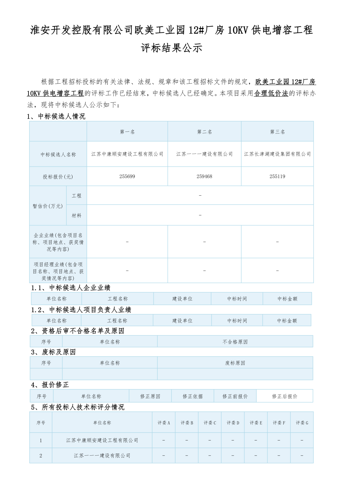 淮安开发控股有限公司欧美工业园12#厂房10KV供电增容工程评标结果公示
